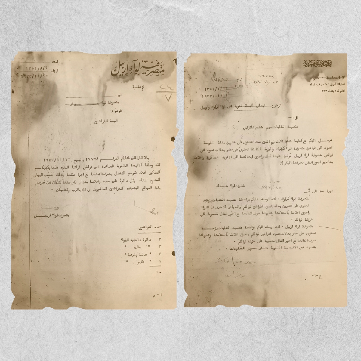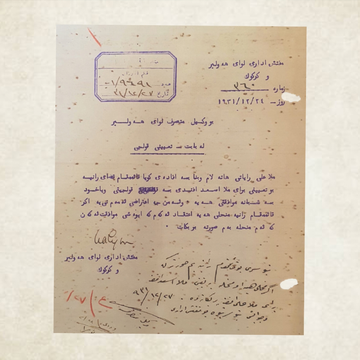 لە ڕۆژی ٢٦/١٠/١٩٥٣ نووسراوێک لە موتەسەڕفیەتی لیوای هەولێرەوە بۆ وەزارەتی ناوخۆی شانشینی عێراق نێردراوە، ئیمزای شاکر فە