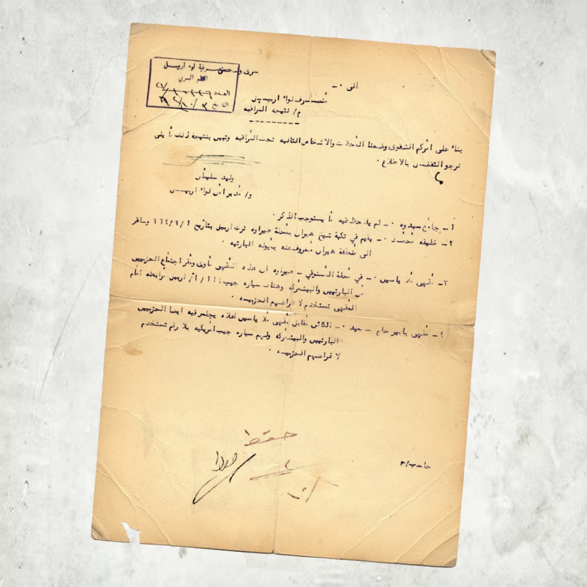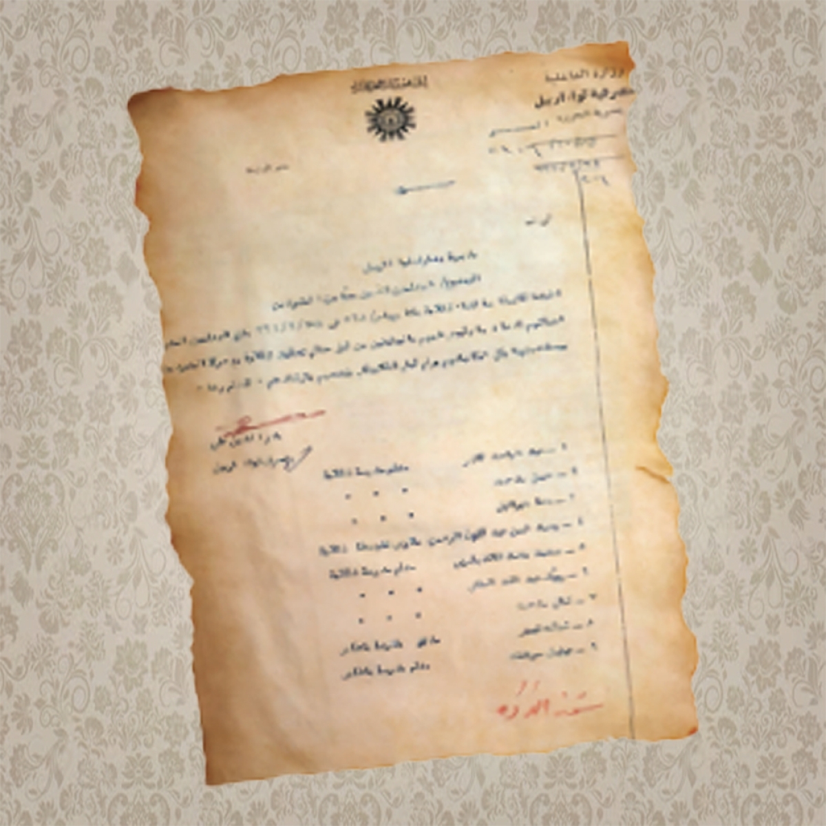 لە ڕۆژی ٢٦/١٠/١٩٥٣ نووسراوێک لە موتەسەڕفیەتی لیوای هەولێرەوە بۆ وەزارەتی ناوخۆی شانشینی عێراق نێردراوە، ئیمزای شاکر فە